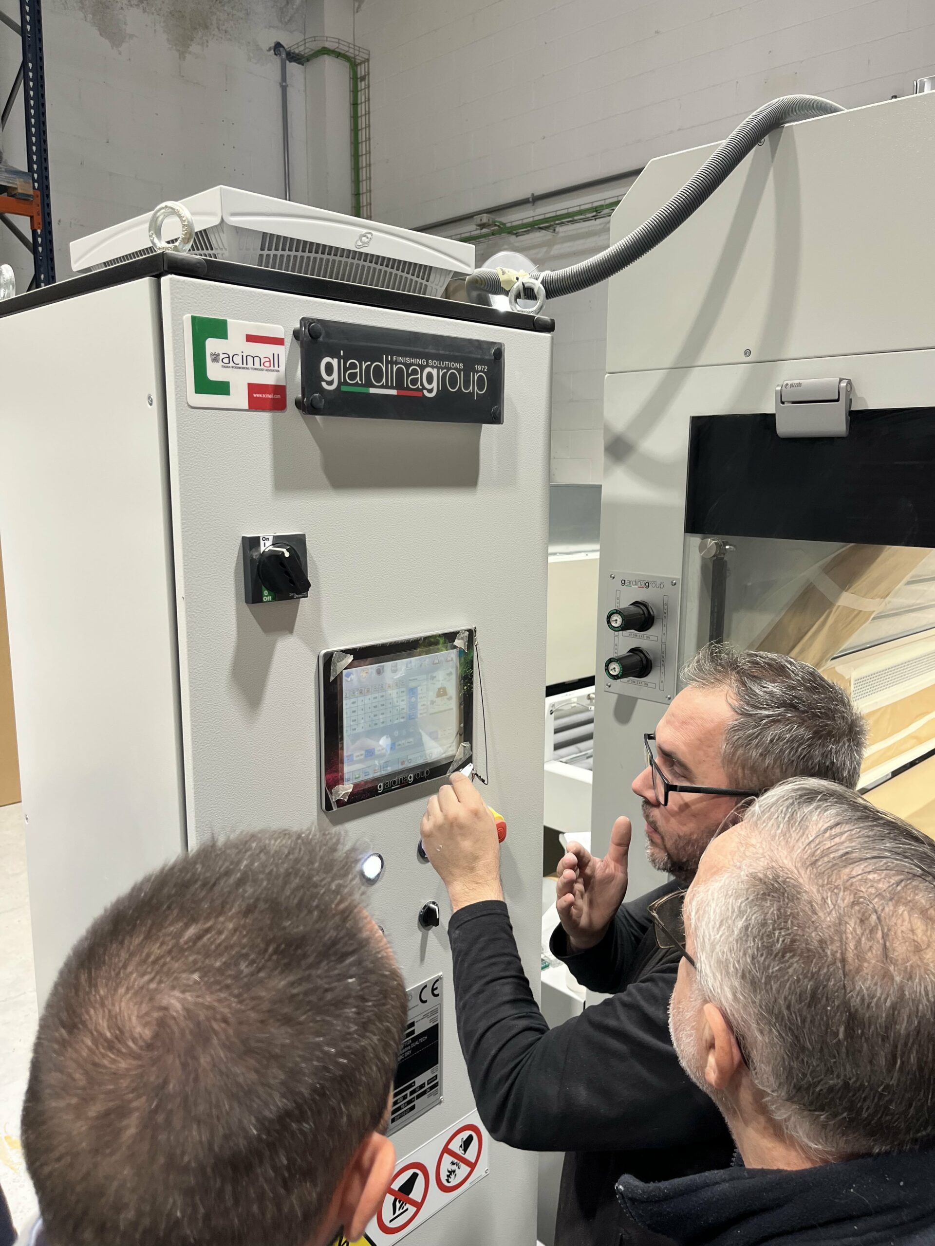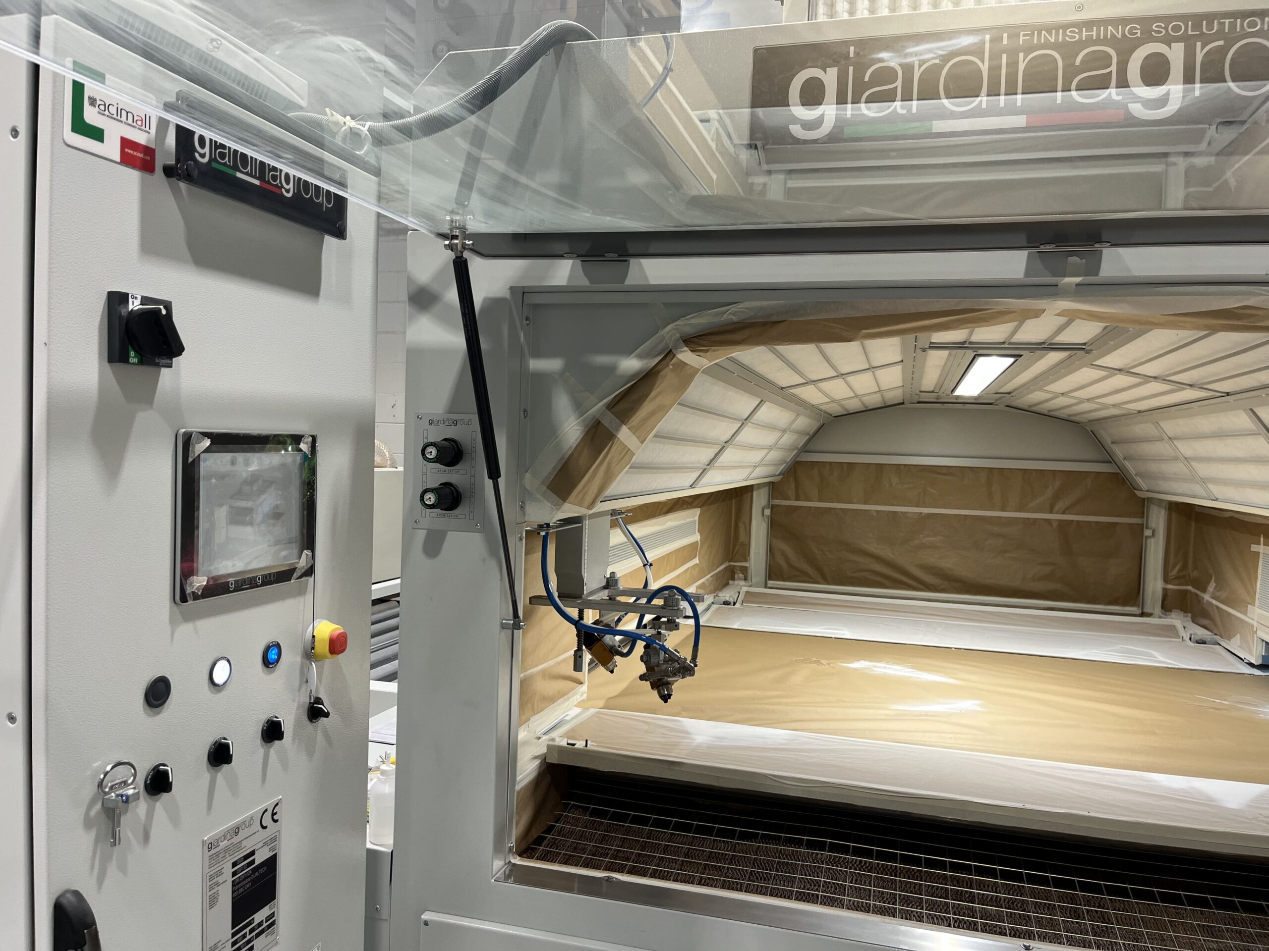 “We installed a high-quality solution, perfectly adapted to the customer’s needs and capable of handling quick changes of product and workflow within the existing space,” says Miguel Usedo, Giardina Group technician. “We configured the ‘Dualtech 400 SBC’ to unload directly into the drying booth, preserving the application quality and avoiding any risk of contamination. It was a more complex job than a simple in-line installation – Usedo explains – but it was the only truly feasible and safe solution for the customer.”