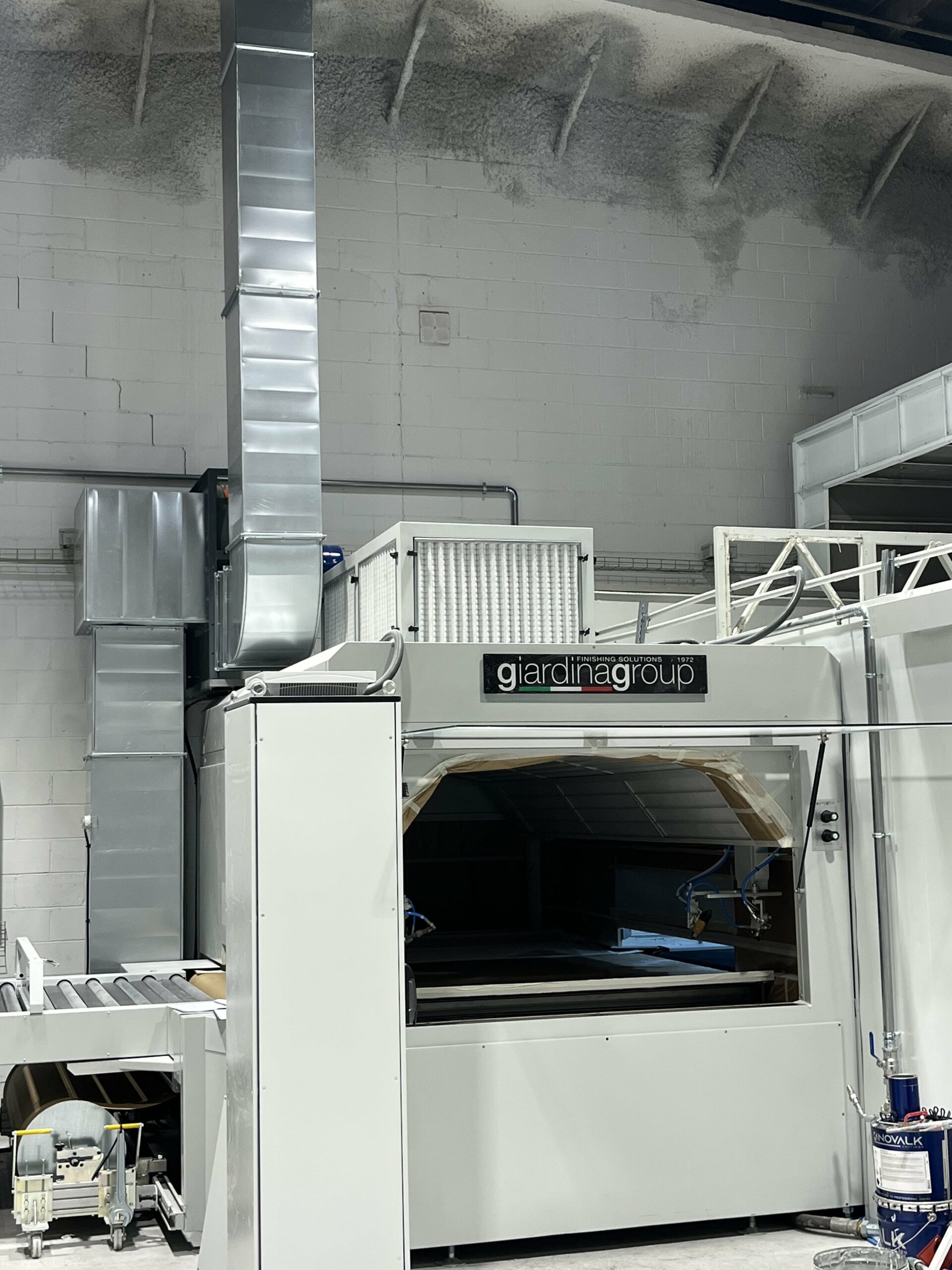 “We installed a high-quality solution, perfectly adapted to the customer’s needs and capable of handling quick changes of product and workflow within the existing space,” says Miguel Usedo, Giardina Group technician. “We configured the ‘Dualtech 400 SBC’ to unload directly into the drying booth, preserving the application quality and avoiding any risk of contamination. It was a more complex job than a simple in-line installation – Usedo explains – but it was the only truly feasible and safe solution for the customer.”